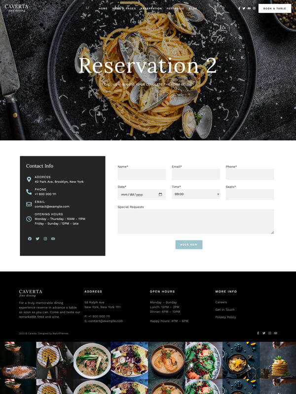 Pre-made reservation form with contact form 7 plugin or using the OpenTable shortcode. You can link to other 3rd party reservations.